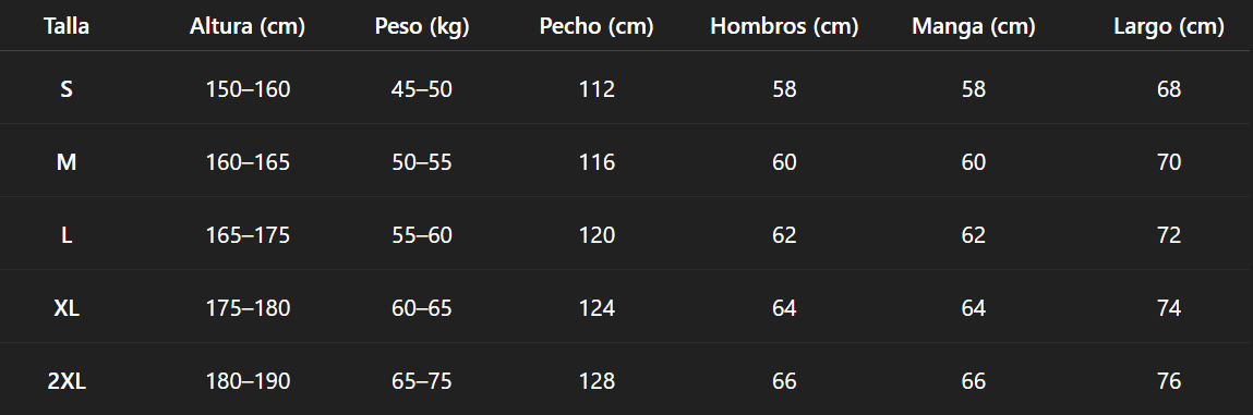 | Talla | Altura (cm) | Peso (kg) | Pecho (cm) | Hombros (cm) | Manga (cm) | Largo (cm) |